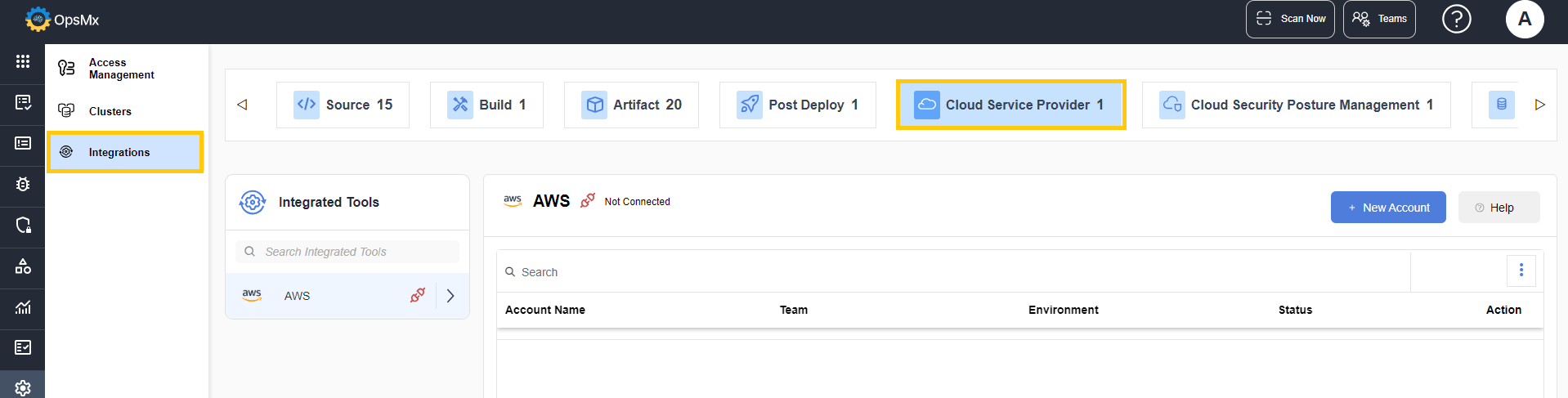 3. The AWS integration page is displayed. Click **+New Account**.&#x20;