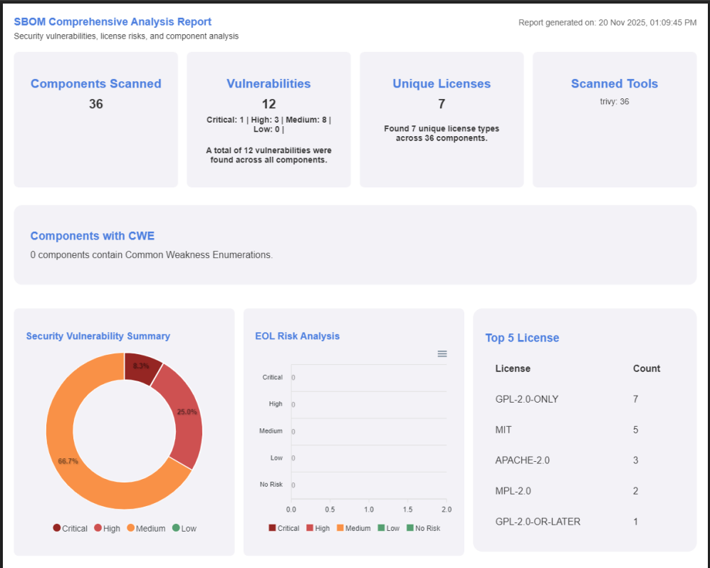 - You can download the SBOM details in report format by clicking the **Report** button. The downloaded report will be a consolidated pictorial form as shown below: