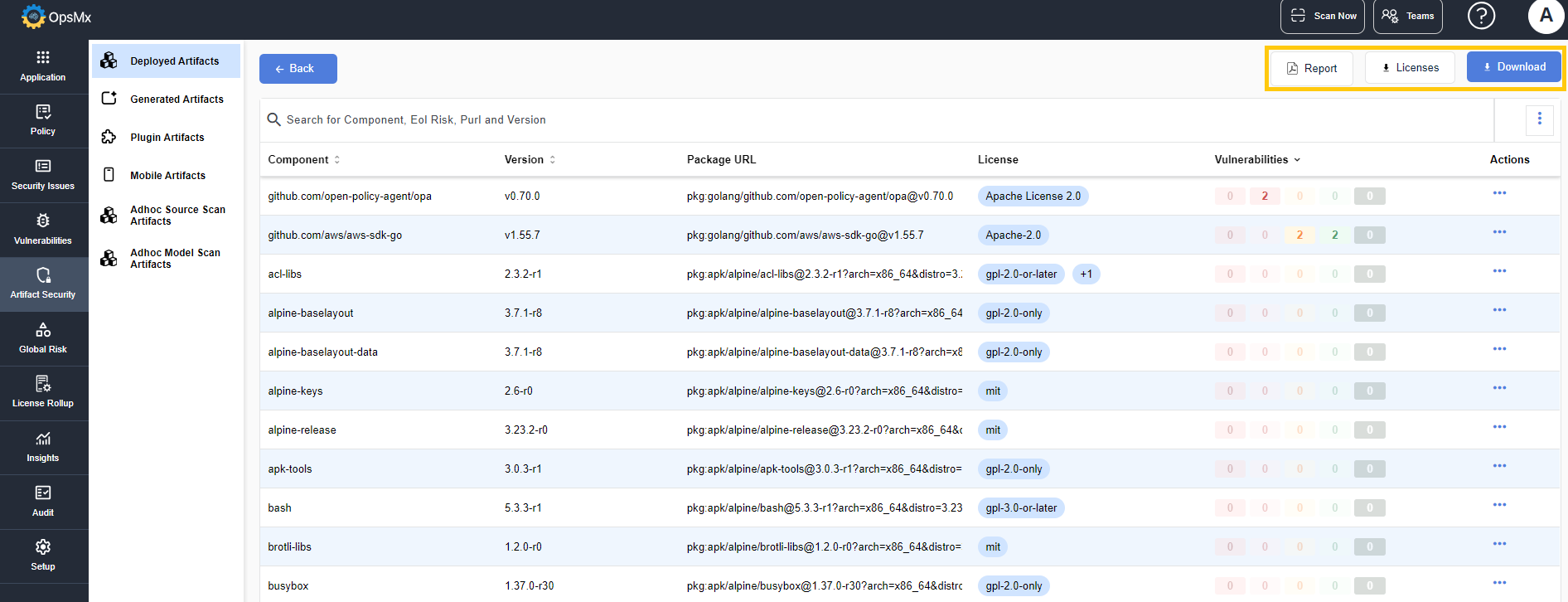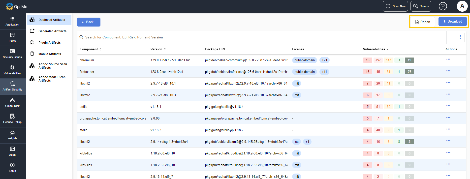 The SBOM details can be downloaded in .Json or .CSV file or .pdf format by clicking the **Download** button.&#x20;