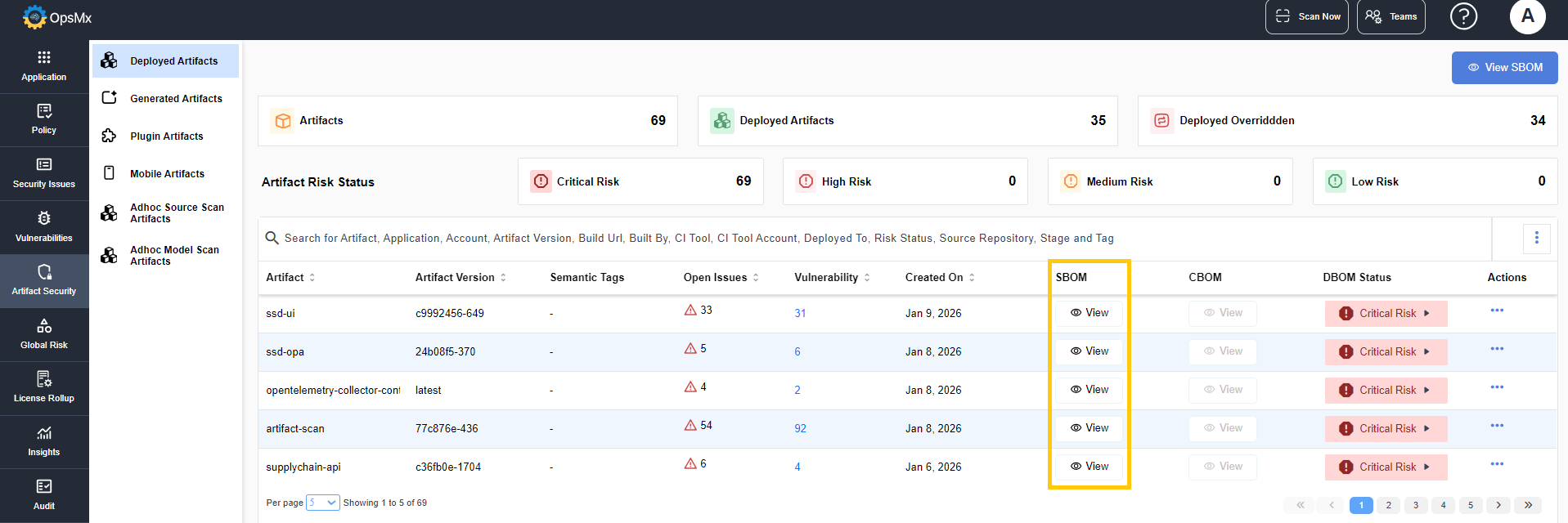 The SBOM for all the deployed artifacts can be viewed by clicking the **View SBOM** option as shown below:&#x20;