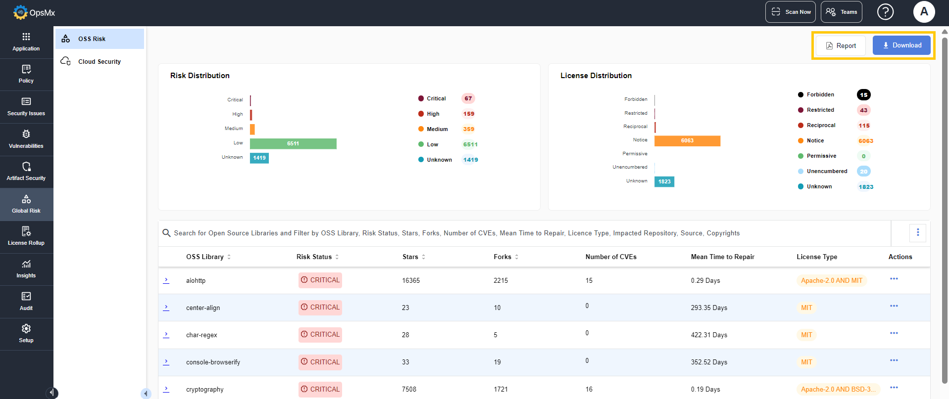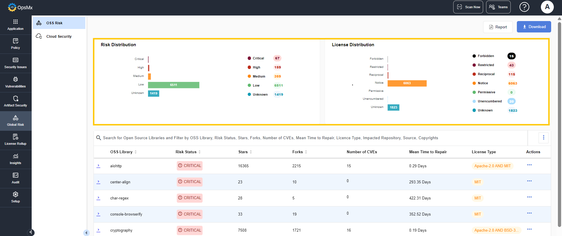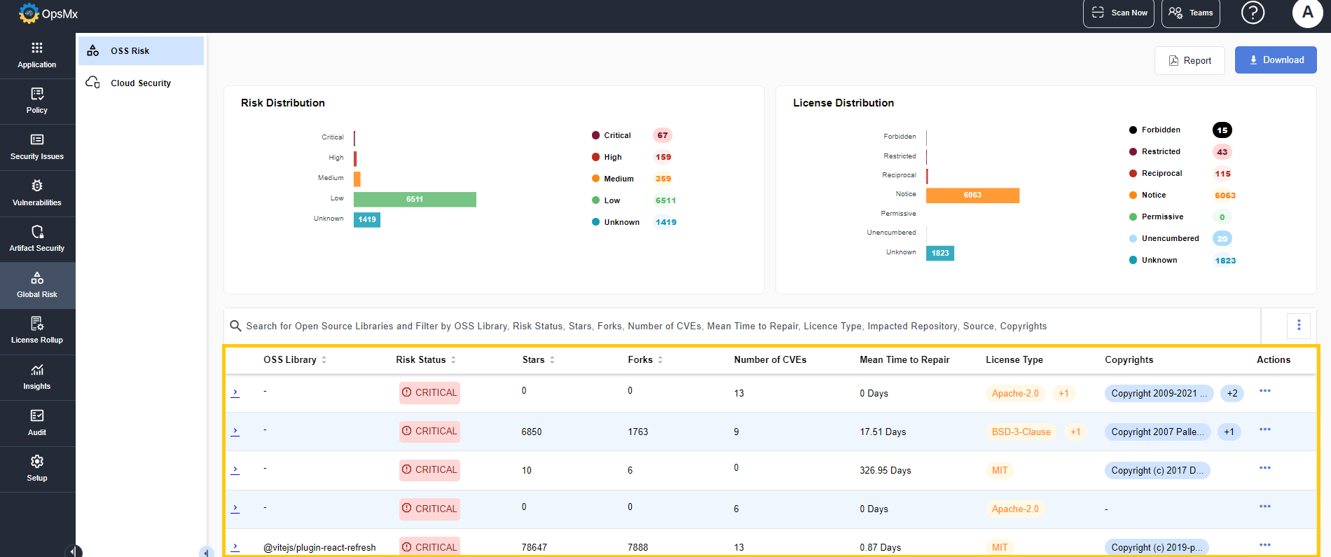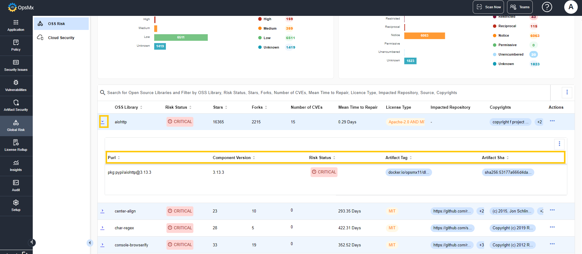 The OSS Risk page analyzes the risk posture of open-source components within the codebase and deployment artifacts. The Global Risk page displays the risk status of the various open-source components found in the discovered artifacts. Detailed insights and assessments of the findings are displayed on this page for better visibility and management.