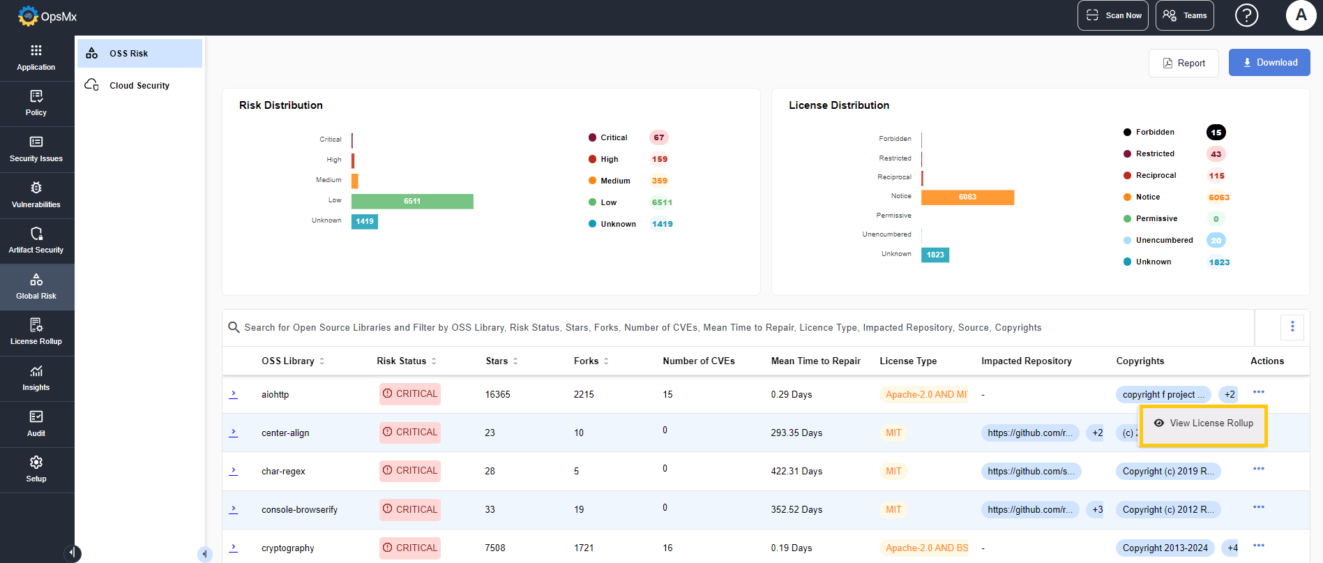 * **Actions** - On clicking the **View License Rollup** option that is displayed, you can view the **License Rollup** for the selected OSS Library.&#x20;