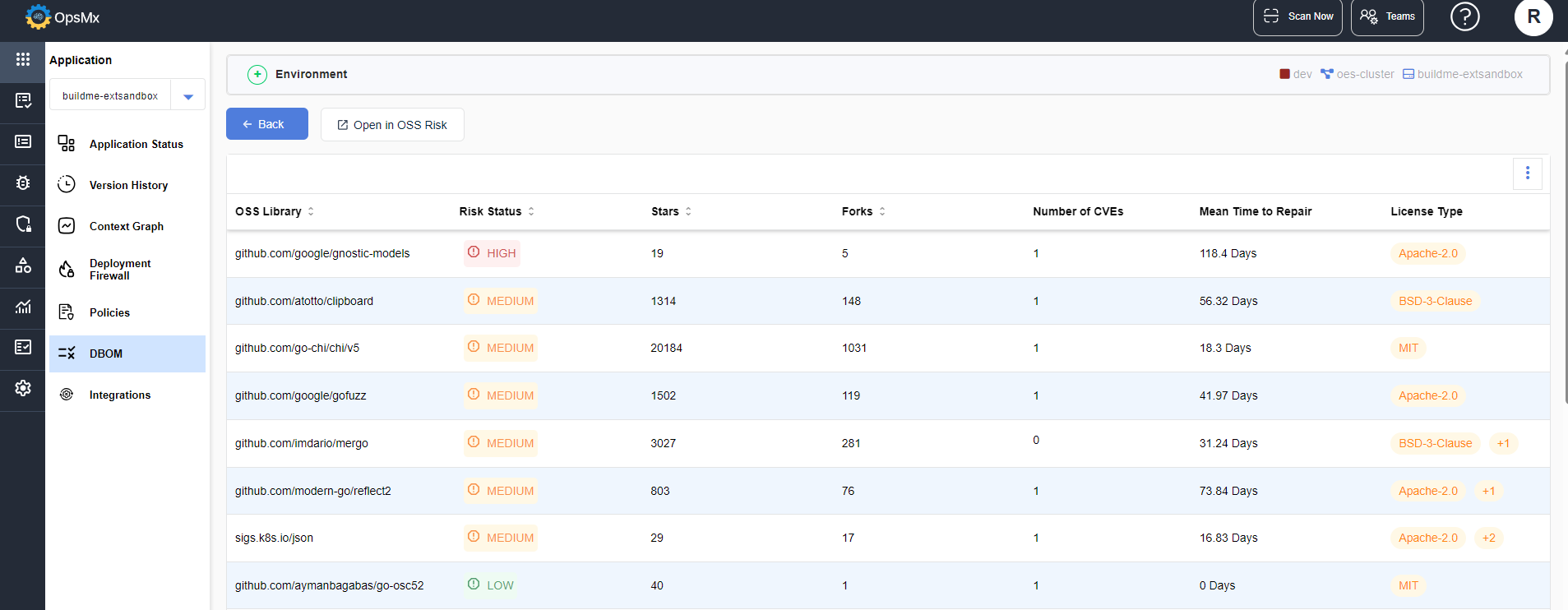 In the OSS Risk column, click View to view the available libraries for the given application and the related details of it.&#x20;
