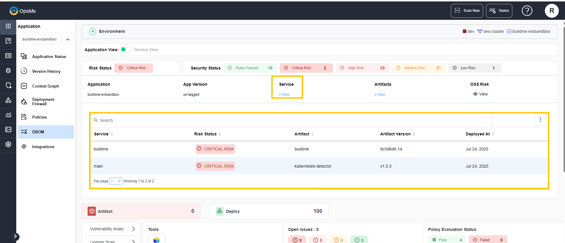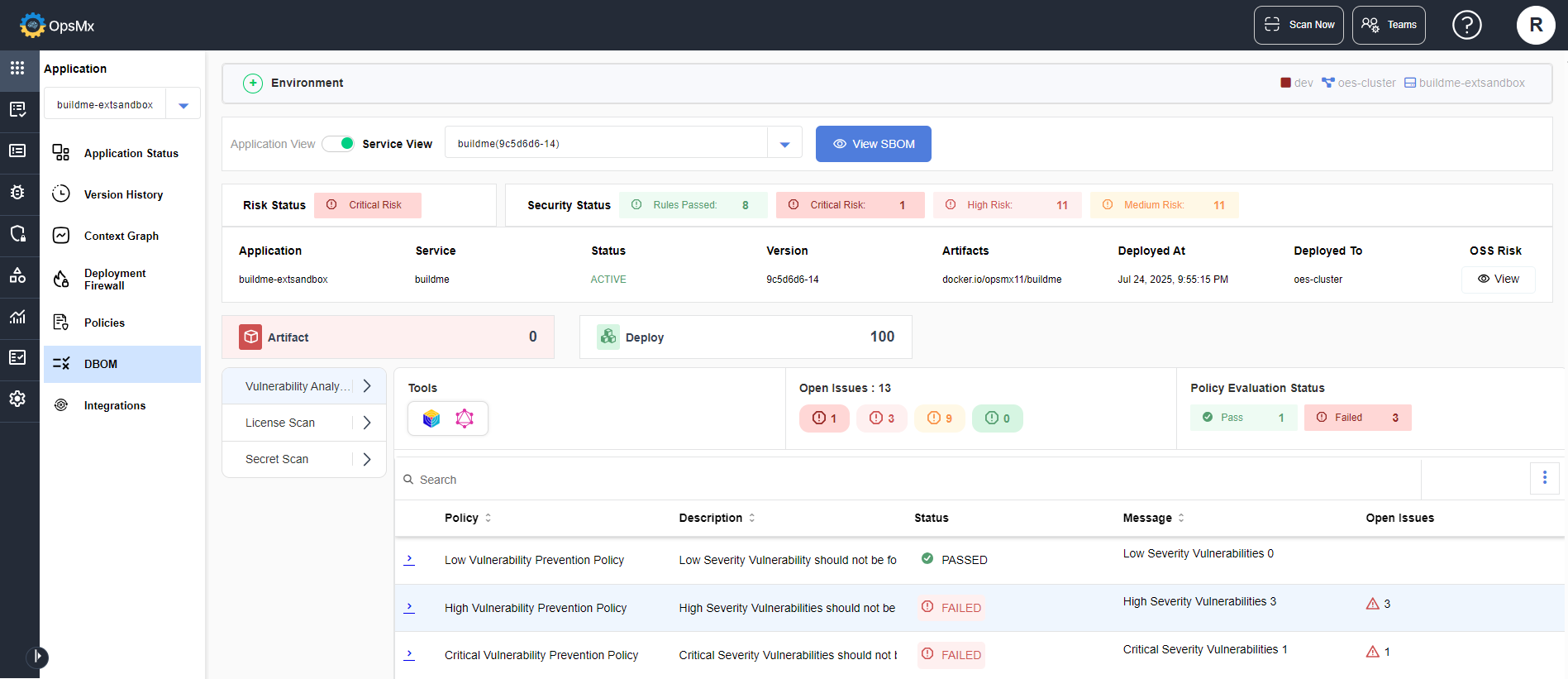 The delivery bill of materials or DBOM for the services is a collection of all policies evaluated across all the deployments in an application, along with a number of services in which they failed or passed. It contain the different stages and their app-level risk status/score and the overall risk status of the application.&#x20;