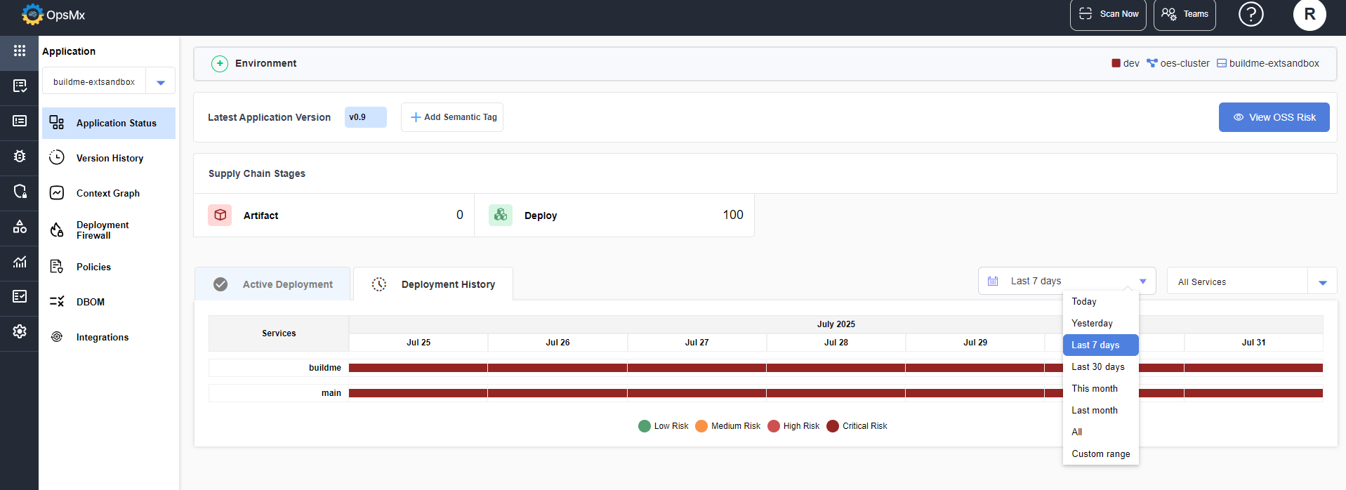 The deployment history section displays the deployments that had occurred for the selected time period. The time period can be **Day View**, **Week View**, **Month View** or you can select **Custom range** and select the specific time period in the calendar displayed.&#x20;